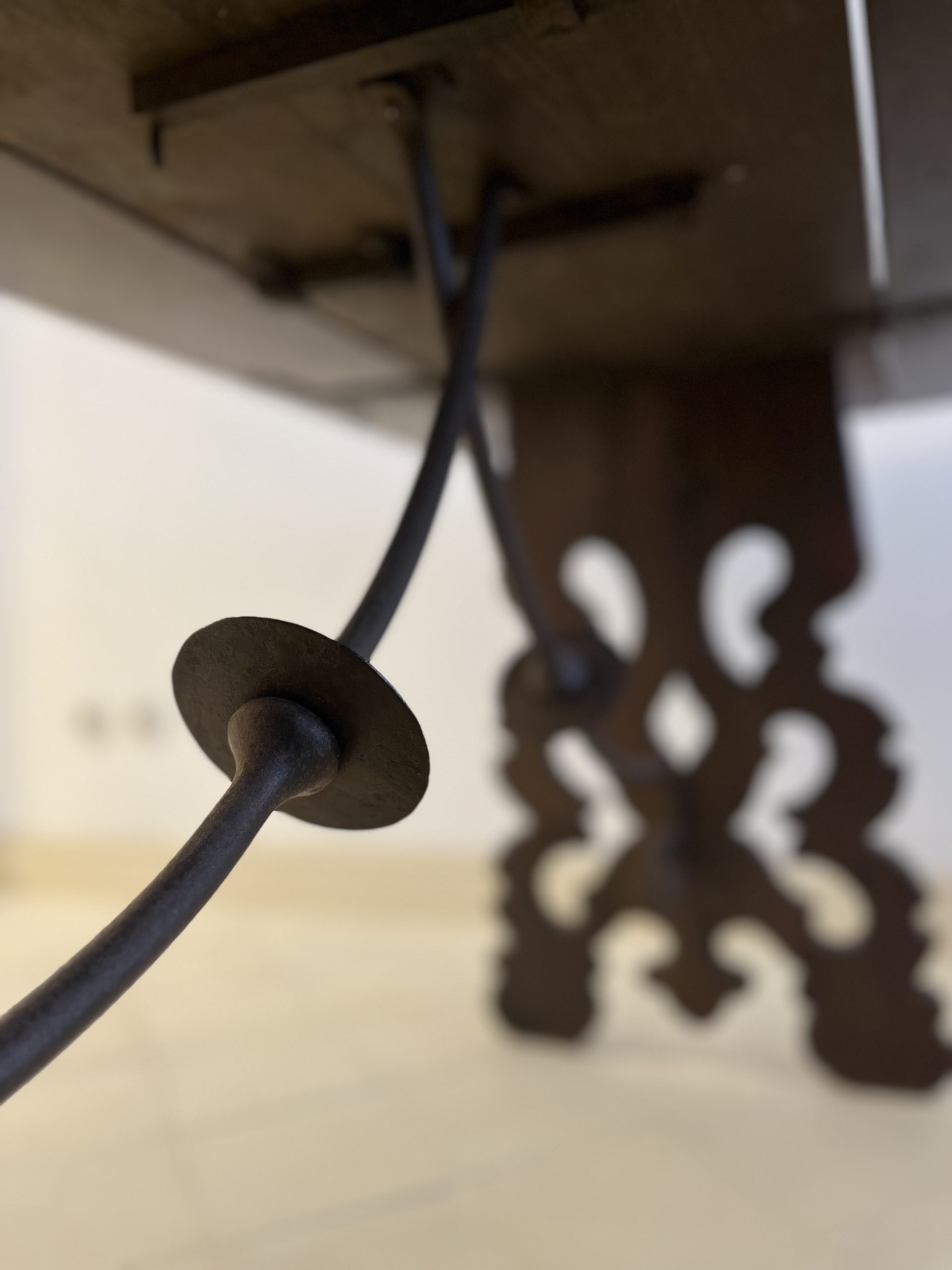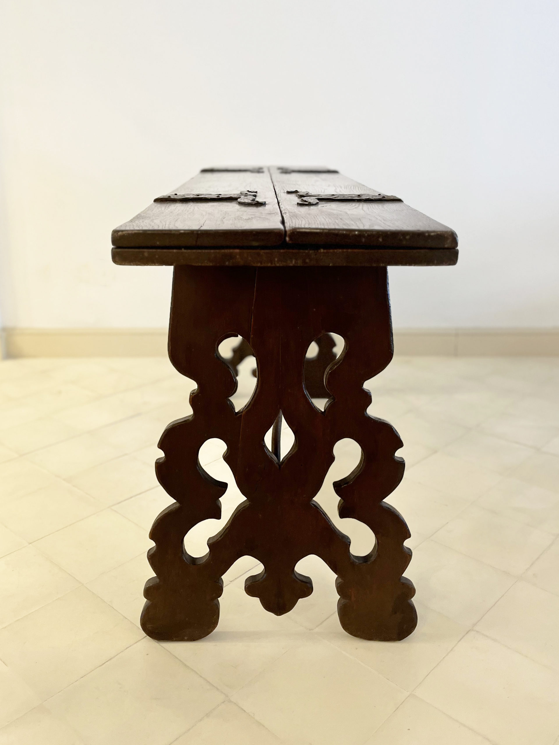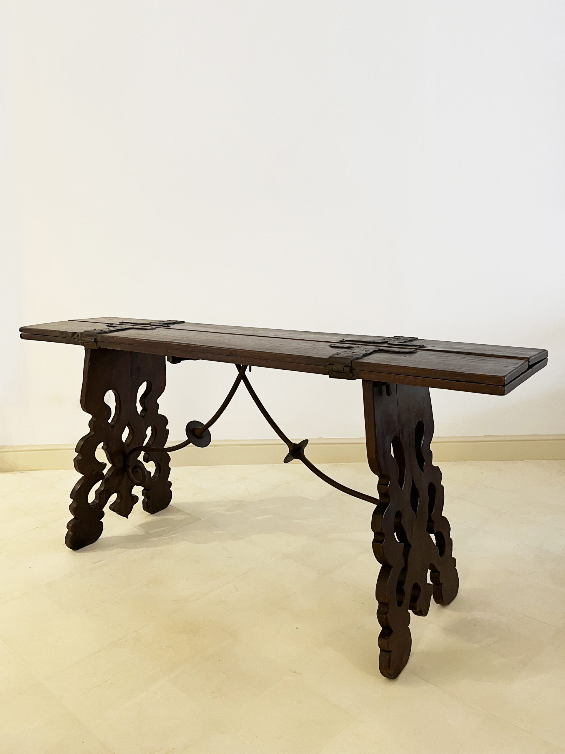 A large oak and wrought iron console table, opening into a middle or dining room table. Spanish work, circa 1940. 160 cm long by 39 cm wide and 74 cm high. Width of the open table, 80 cm.