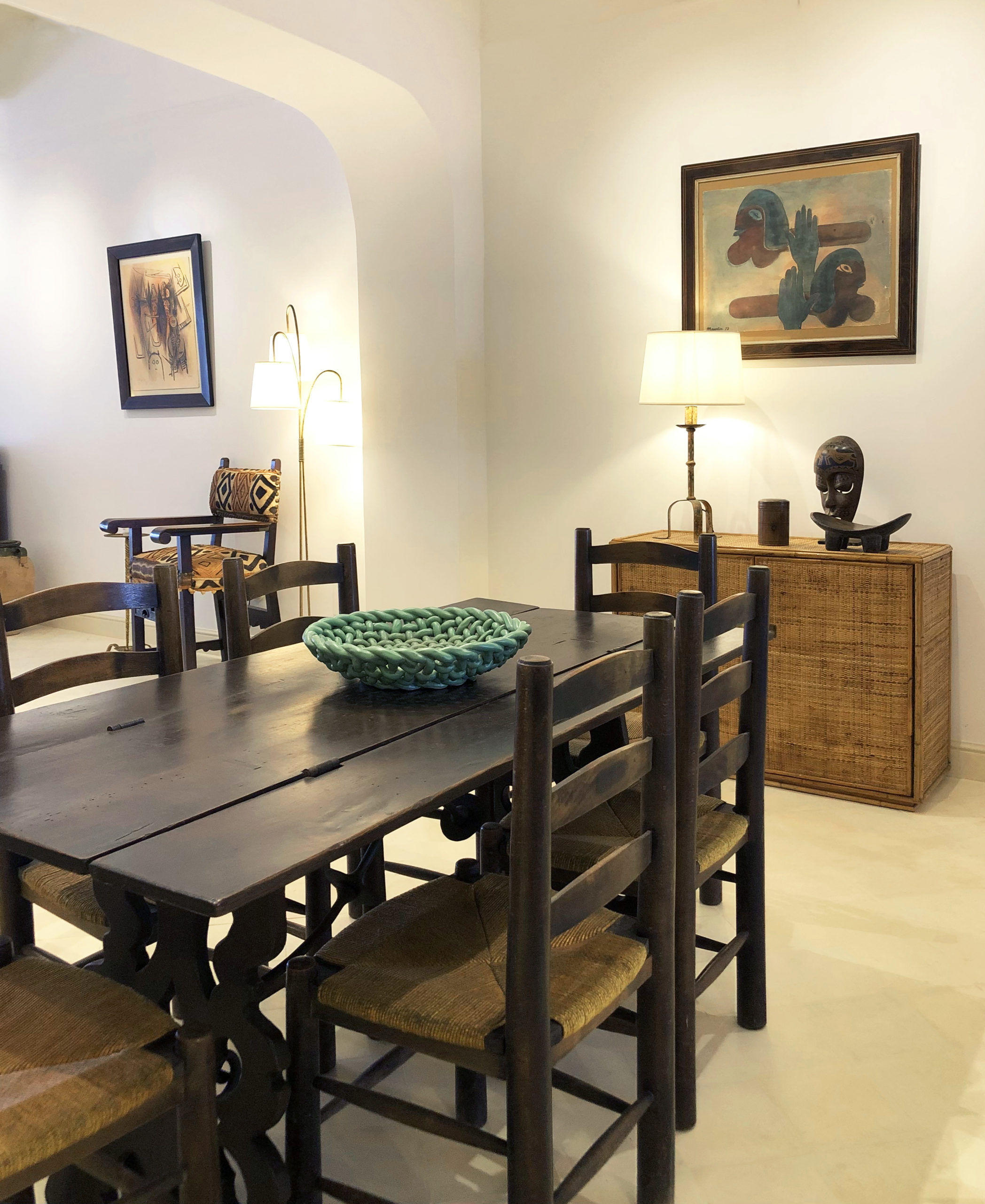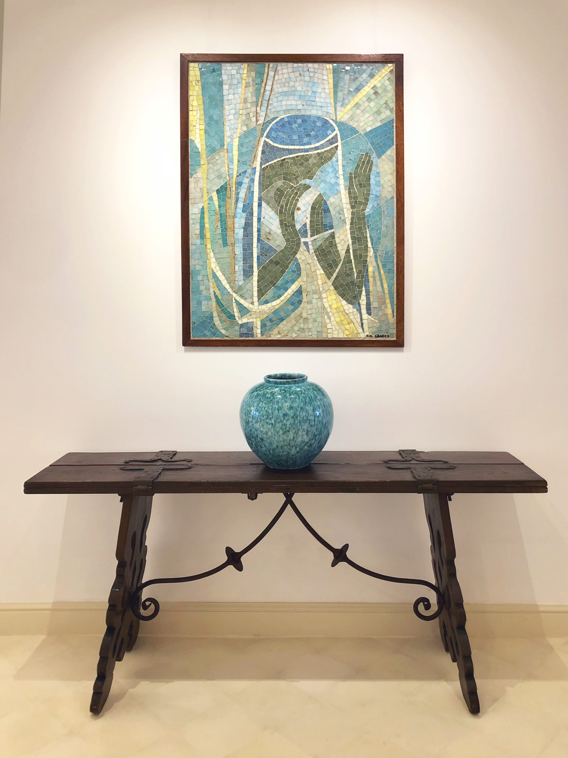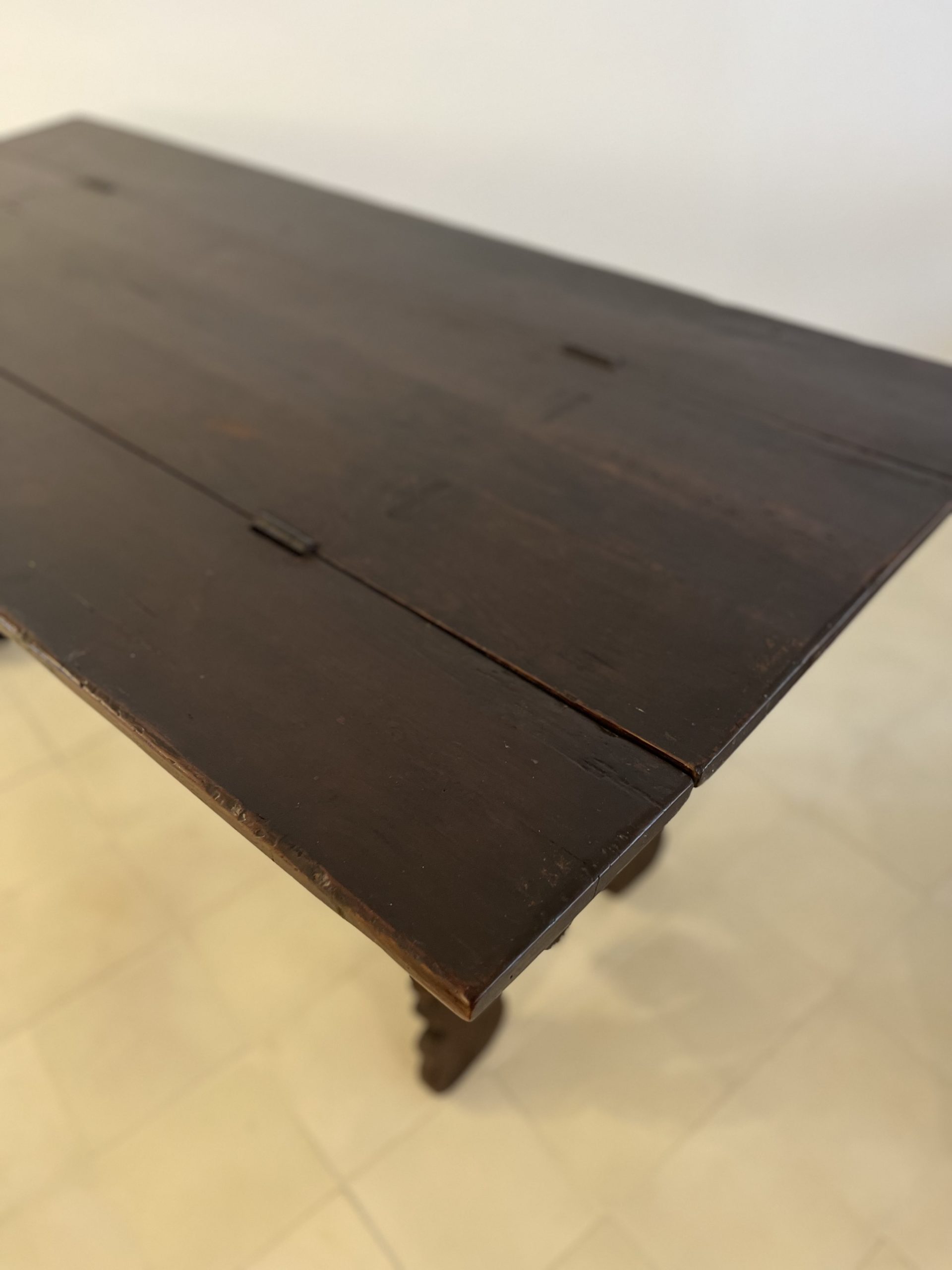 A large oak and wrought iron console table, opening into a middle or dining room table. Spanish work, circa 1940. 160 cm long by 39 cm wide and 74 cm high. Width of the open table, 80 cm.