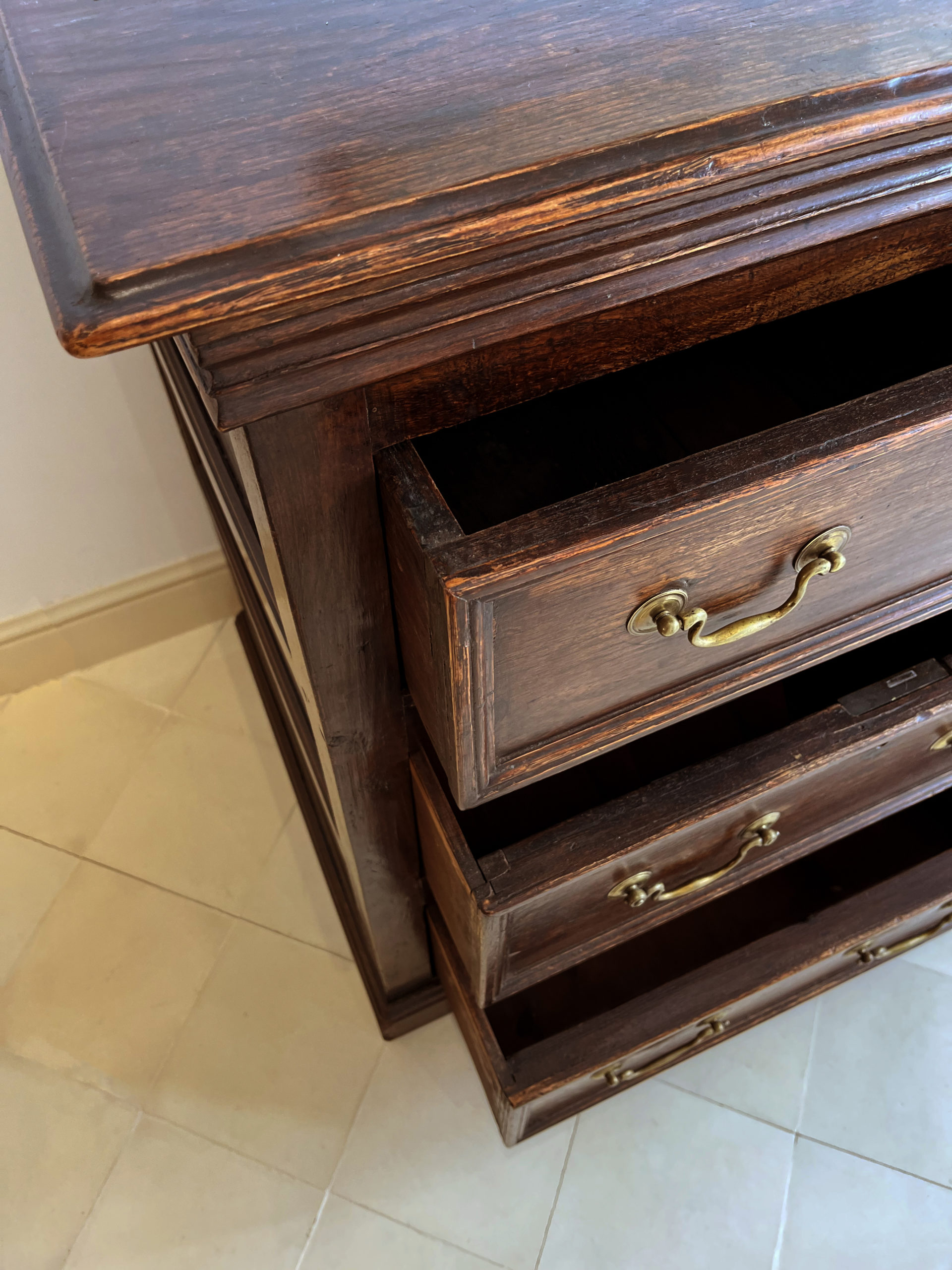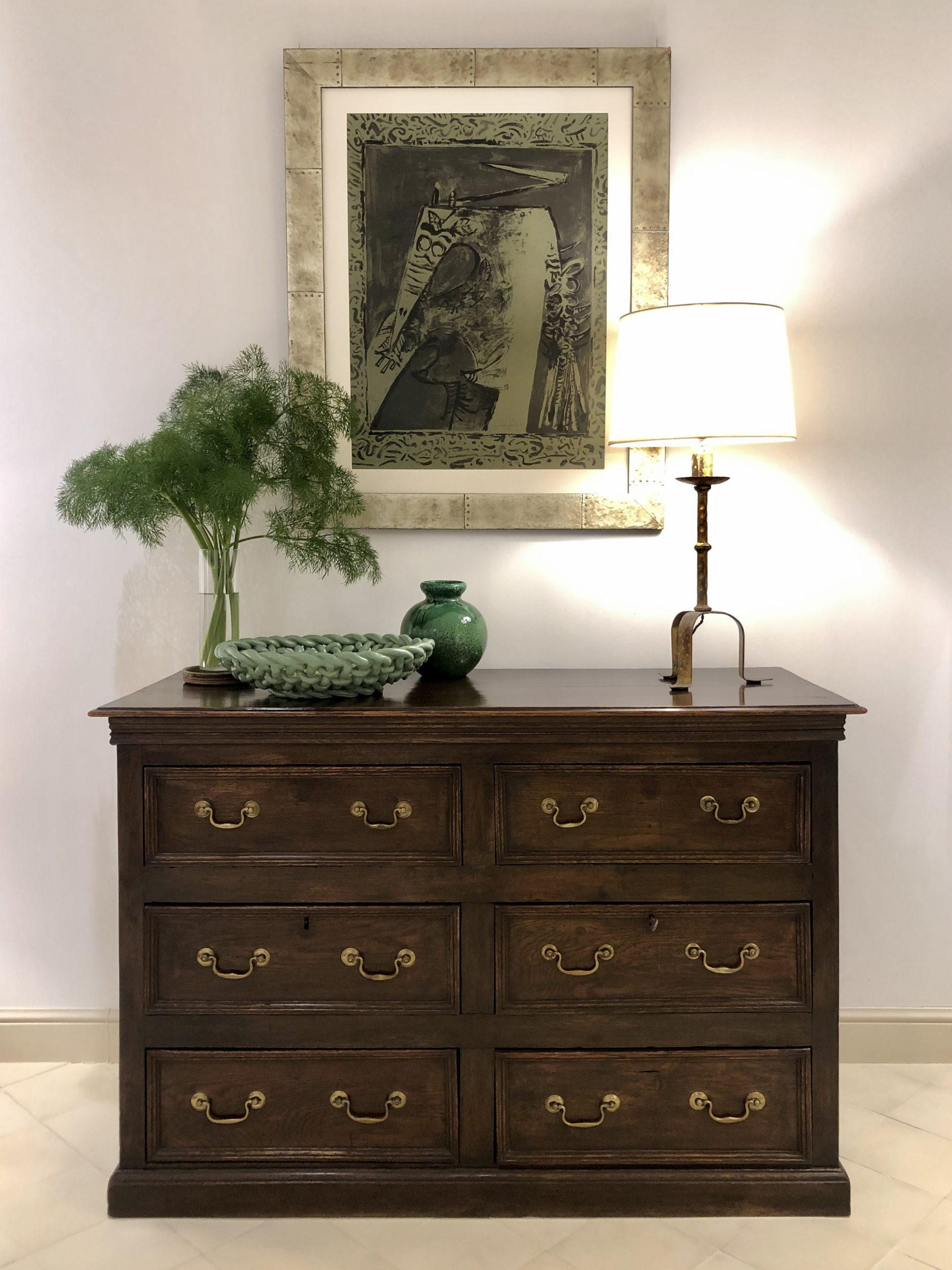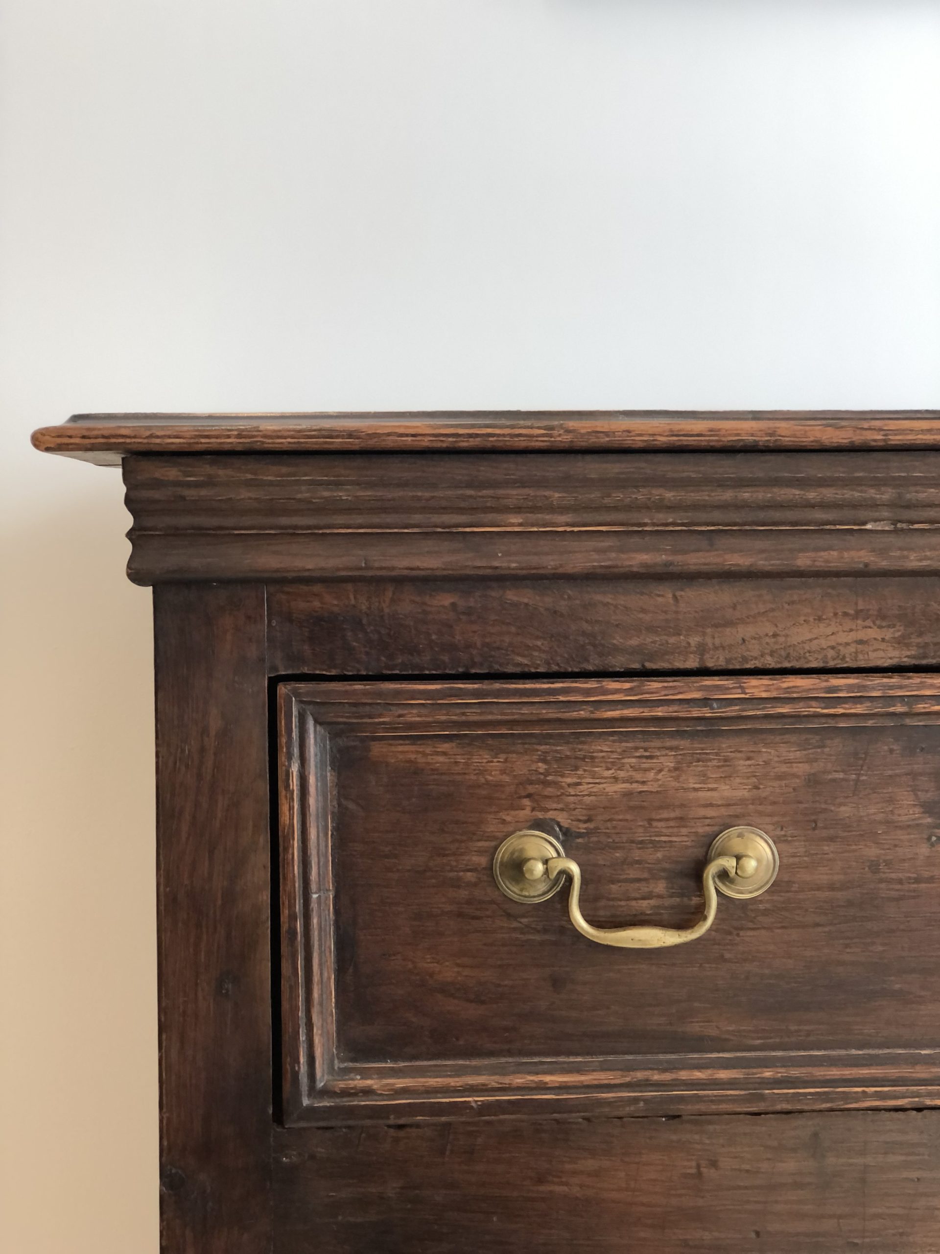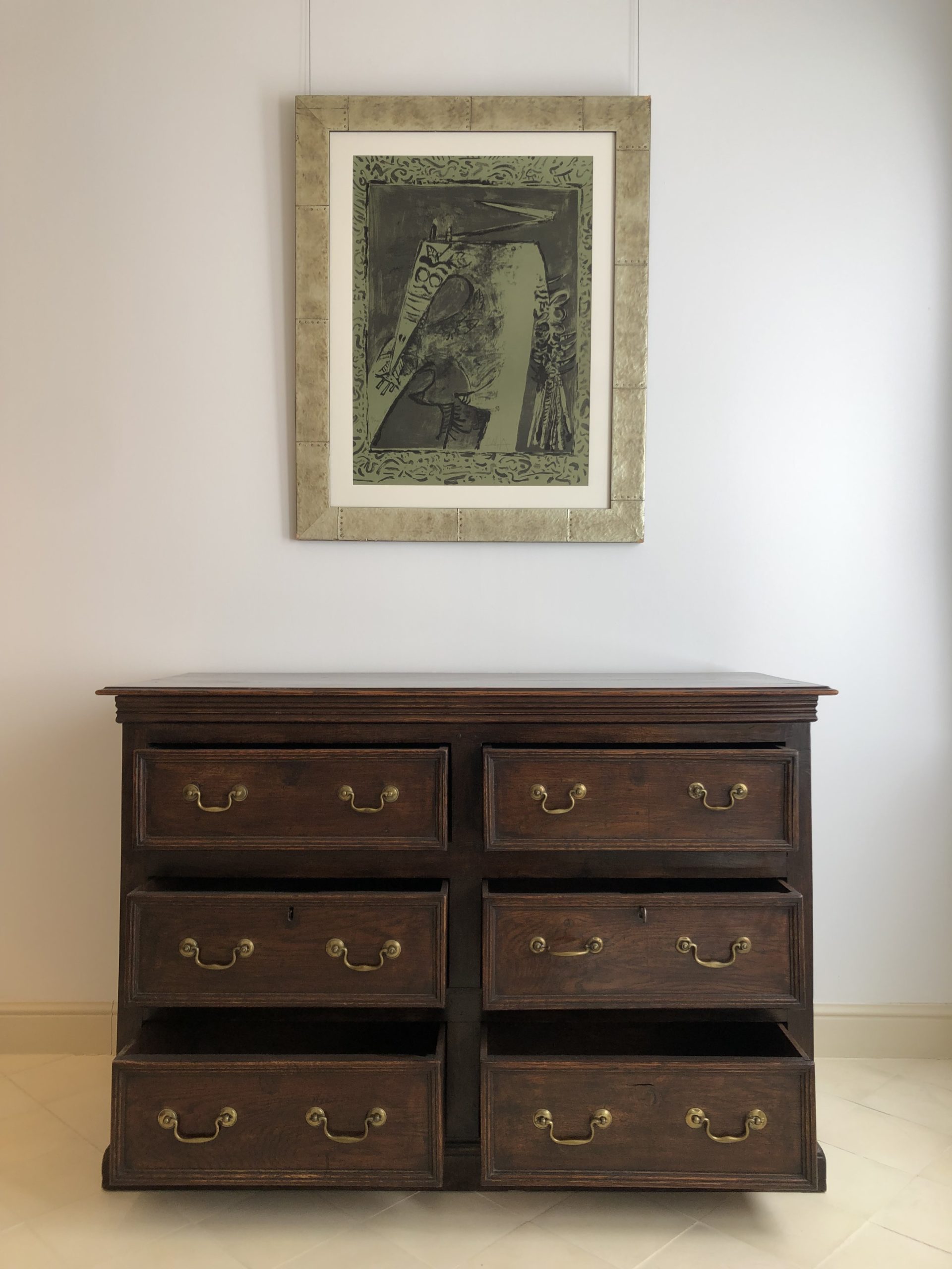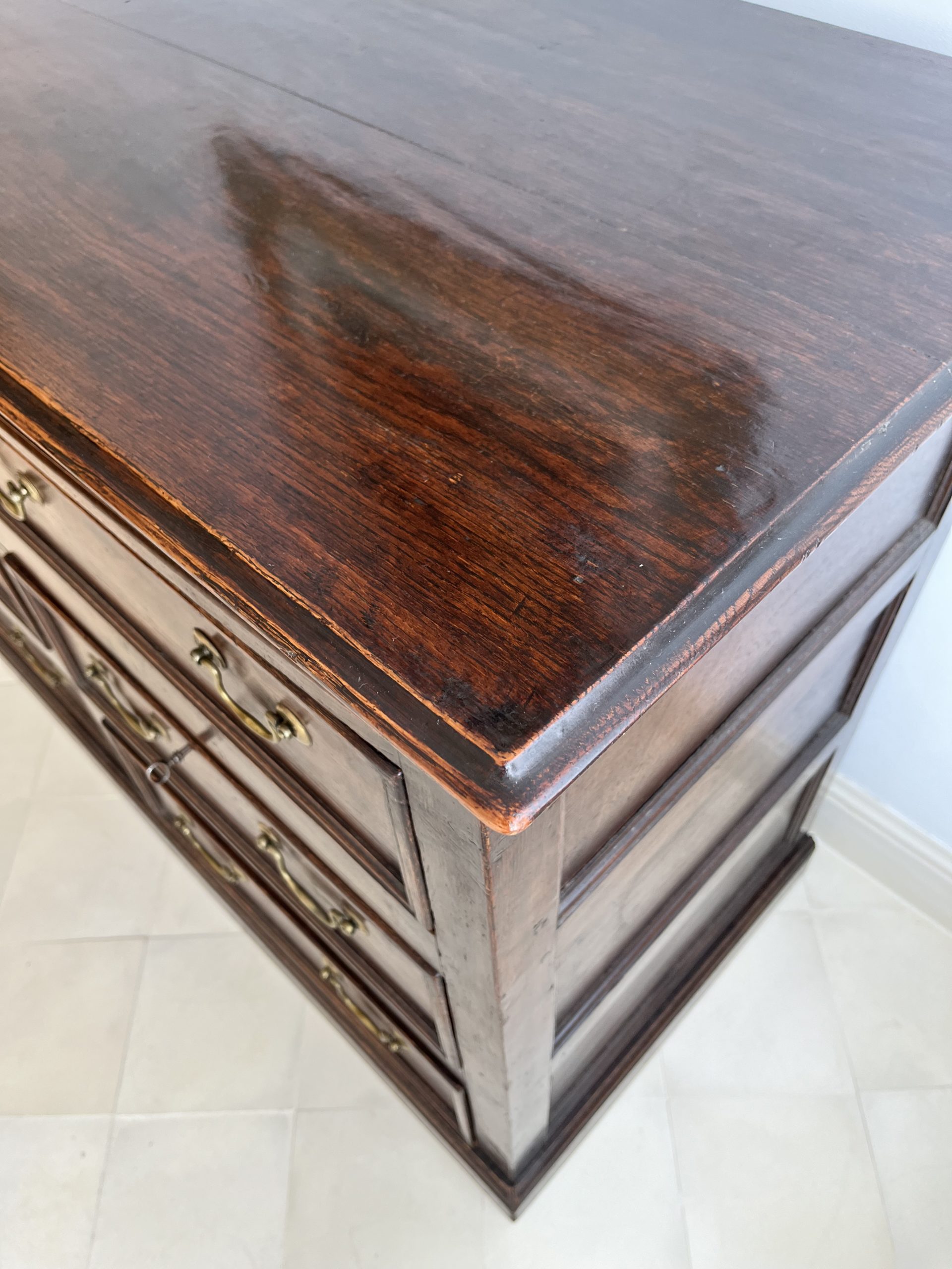 Solid oak, opening with six drawers decorated with brass handles. English work, circa 1790. 132cm long by 54cm wide and 90cm high.