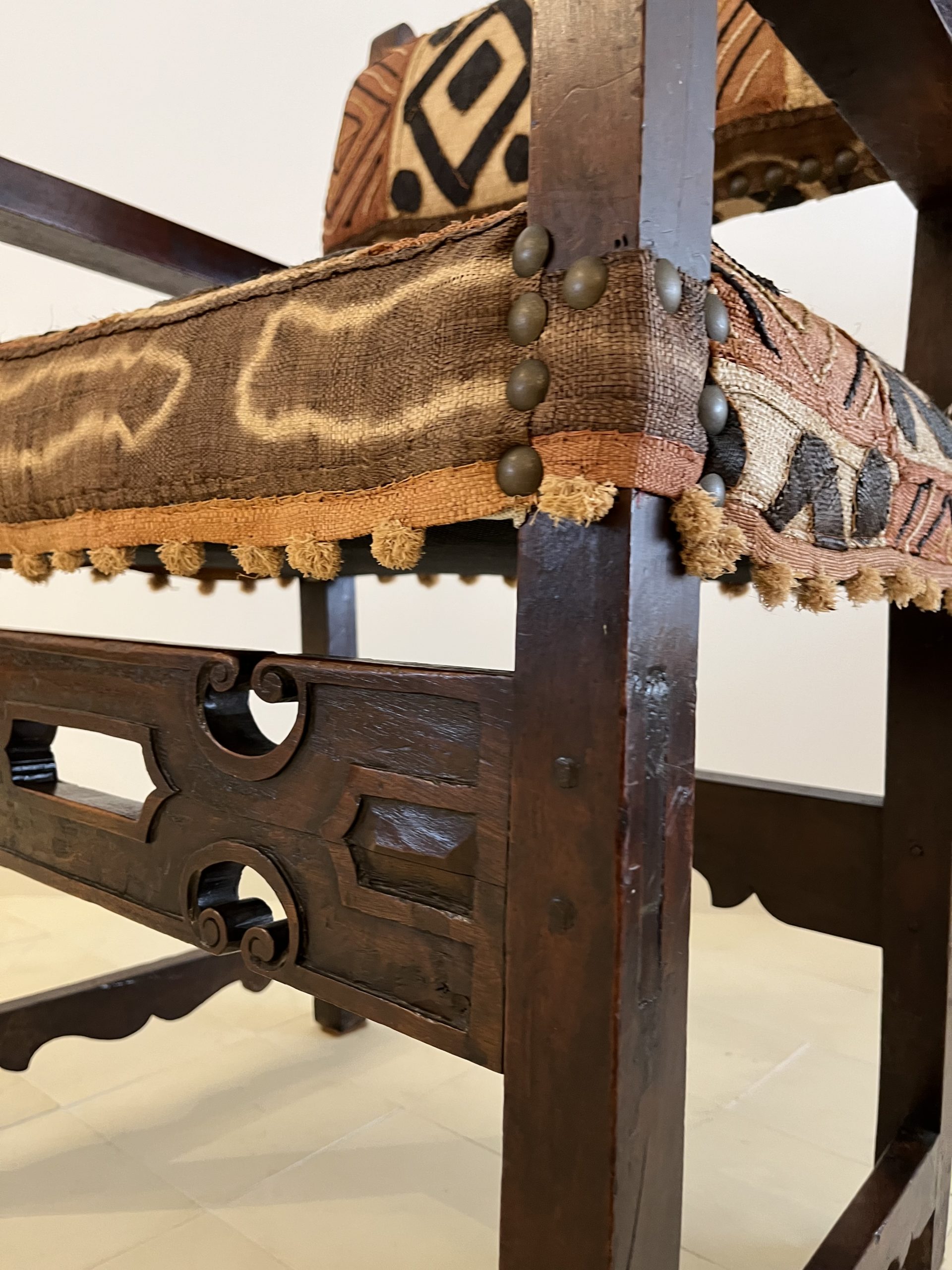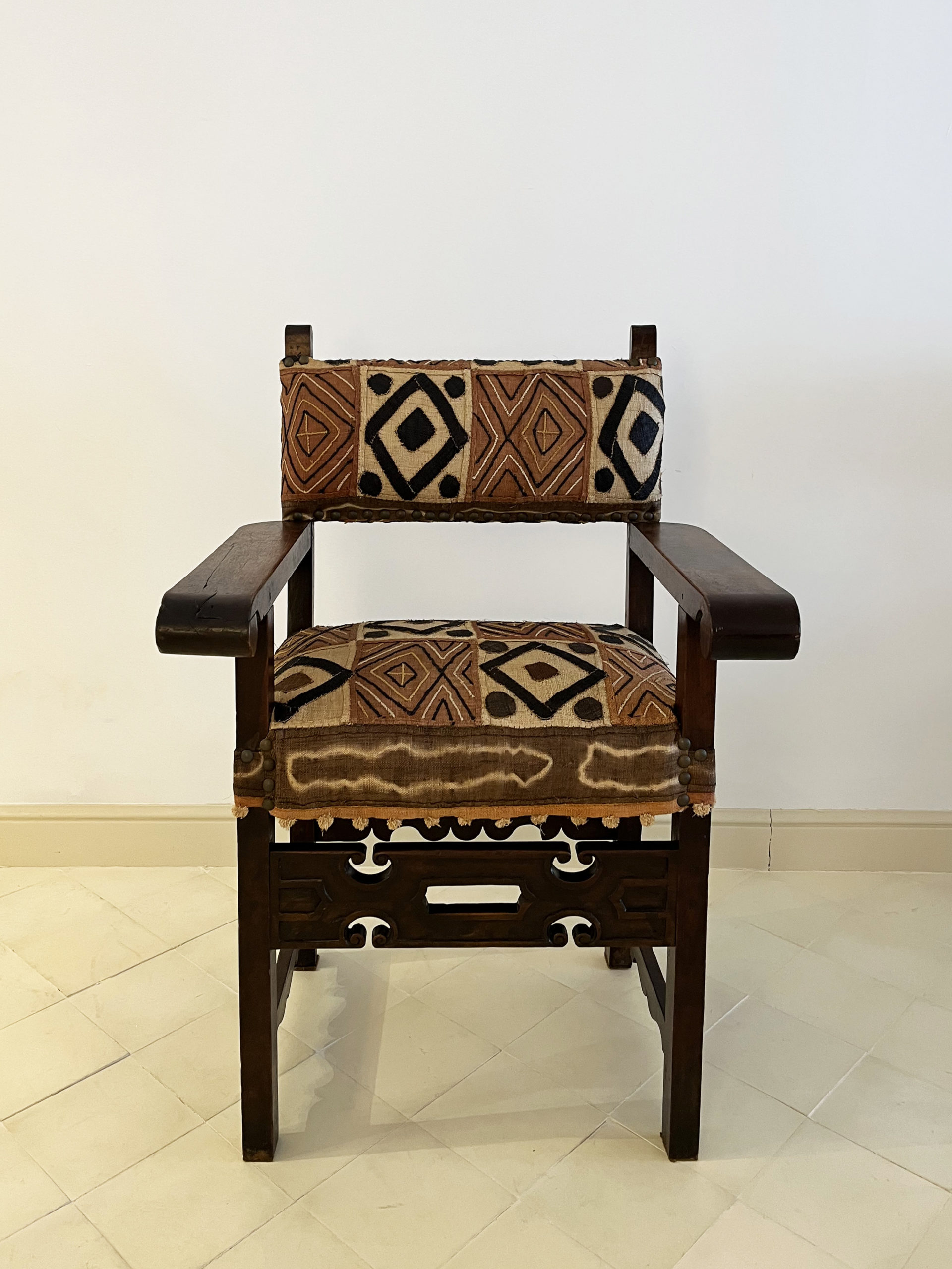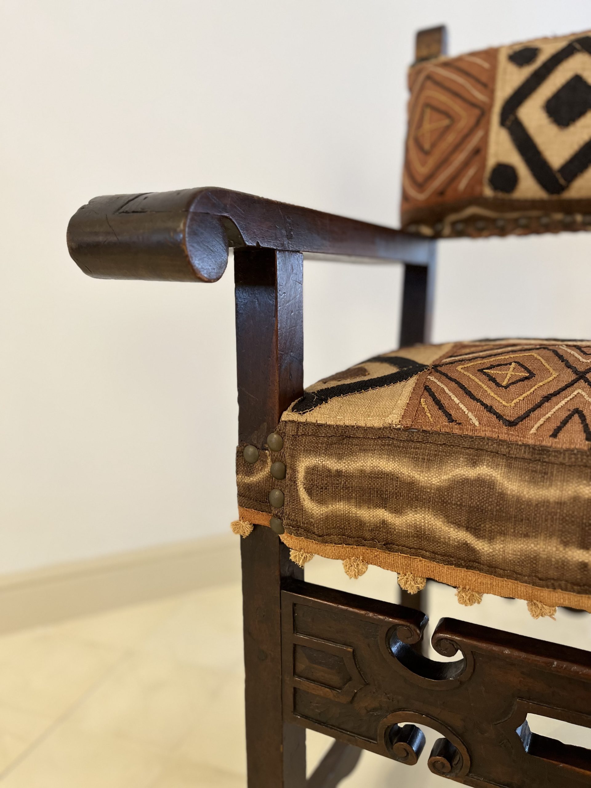 French work, late 19th century. Upholstered with a Kuba (Congo) woven raffia cloth, 20th century. 102cm high by 73cm wide. 57cm seat height and 43cm deep.