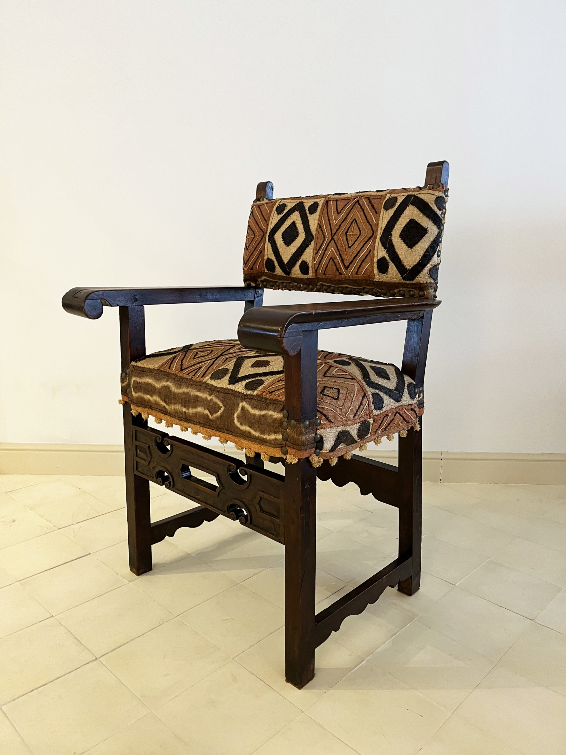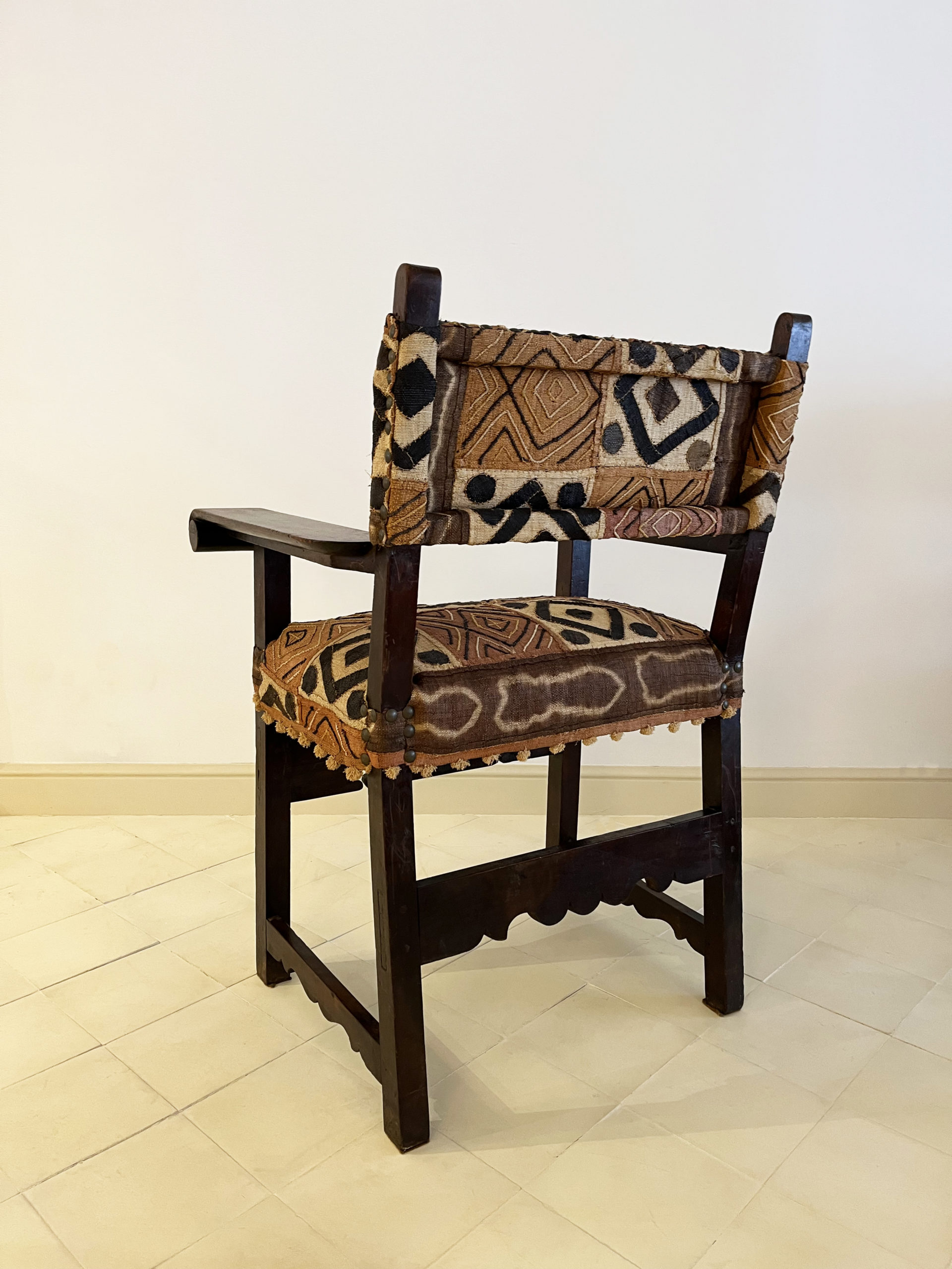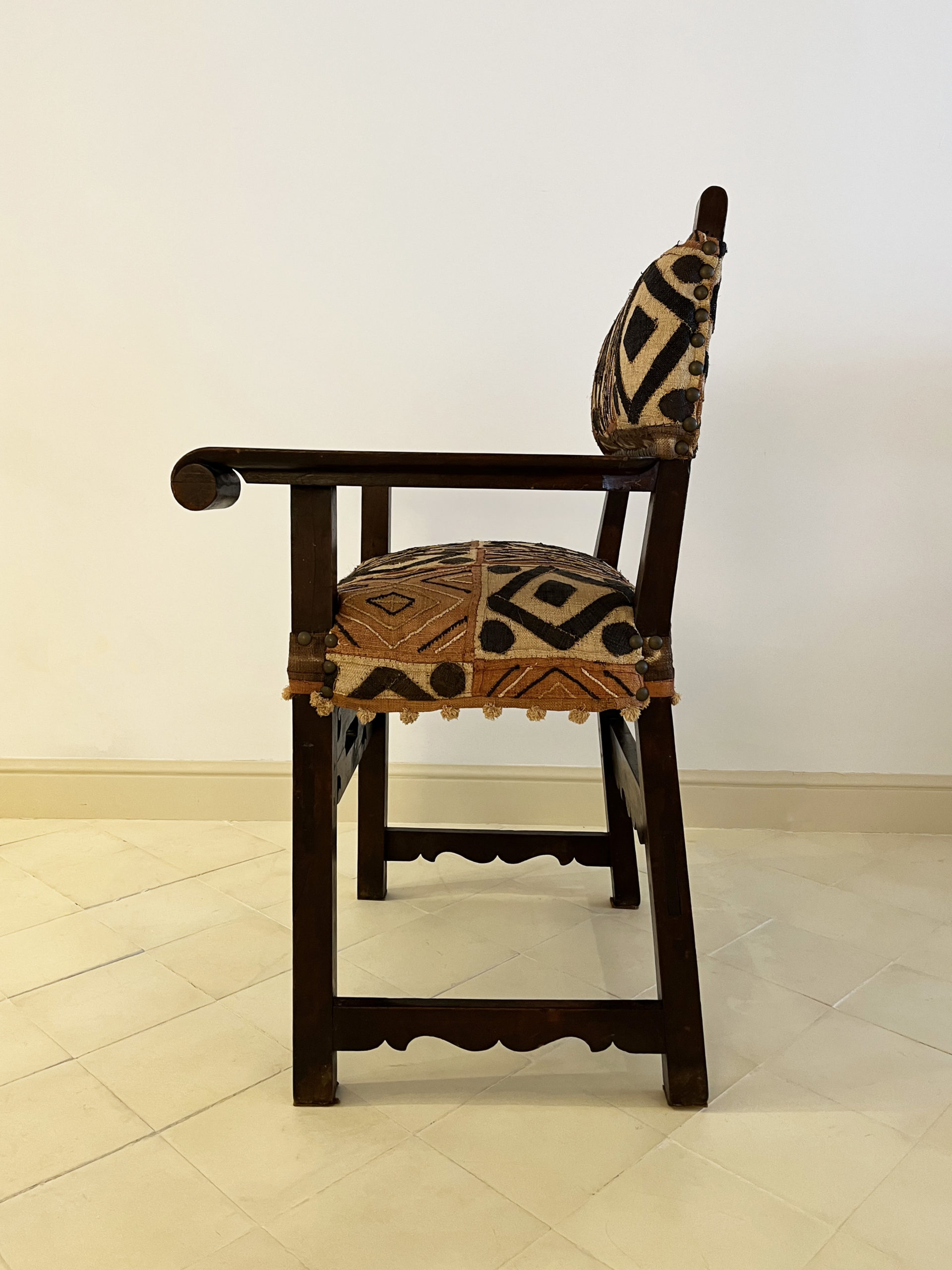 French work, late 19th century. Upholstered with a Kuba (Congo) woven raffia cloth, 20th century. 102cm high by 73cm wide. 57cm seat height and 43cm deep.